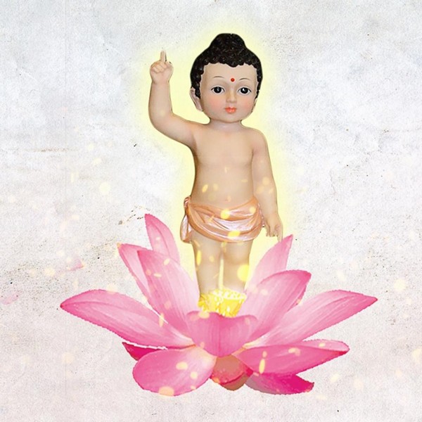 Điều kỳ diệu đã xảy ra khi Thái tử mới lọt lòng. Ngài tự mình đứng dậy và bước đi bảy bước. Dưới mỗi bước chân, một đóa hoa sen tuyệt đẹp nở rộ. Đến bước thứ bảy, Ngài dừng lại, ngước nhìn lên bầu trời bao la và với tay xuống mặt đất. Rồi Ngài tuyên bố một cách trang nghiêm: “Trên trời dưới đất, chỉ có tôi là người cao quý nhất”.